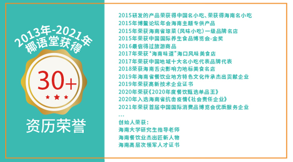 椰語堂始創于2012年,是海南一家把海南清補涼為代表的特色小吃精致化、標準化并進行連鎖發展的企業,椰語堂專注于海南本土地域特色元素特別是椰子系列產品的深度研發。椰語堂被評為海南風味小吃一級品牌名店,椰語堂多款小吃被評為海南名小吃、中國名小吃,并被選為中國地域十大名小吃代表品牌。椰語堂的全國門店分布在各高端商場、機場、郵輪、五星級酒店、動車站、景區等。椰語堂清補涼被選為博鰲亞洲論壇專供產品、中國國際養生食品博覽會金獎等殊榮,椰語堂清補涼在線下各連鎖賣場、盒馬鮮生、中石化易捷、中石油昆侖、全國30多家機場、五星、七星酒店等渠道銷售并成為政府及集團采購產品。在電商線上渠道,椰語堂椰奶清補涼無論在銷量和好評方面是品類第一,是深受消費者喜愛的高品質產品。椰語堂是海南大學食品學院研究生實習基地,公司發揮椰語堂研究院優勢,擁有產品研發方面的多項專利。椰語堂因為其優秀品質及良好顧客體驗,被中央電視臺、湖南衛視、旅游衛視等多家衛視、人民日報、中國縣域經濟報、新浪、騰訊、SSBD等國內外媒體報道宣揚。椰語堂是海南文化的傳播和弘揚者,是海南地標美食品牌的優秀代表和海南地域文化的一張亮麗名片,同時,椰語堂也是中國連鎖經營協會會員單位。